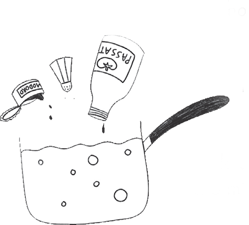 Pour préparer le bouillon de torture des spaghettis, mélangez 200ml d’eau, le concentré de tomates et 300ml de passata dans une casserole de 4 litres.