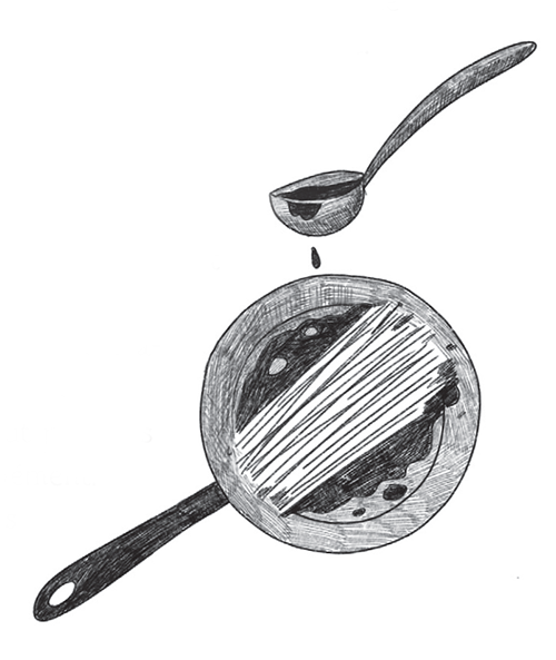 Choisissez la plus grande poêle antiadhésive de la cuisine : assez grande pour assommer quelqu’un, et même le tuer mais surtout assez large pour y mettre plus tard les spaghettis crus sans les casser.