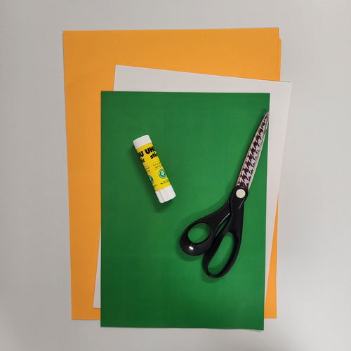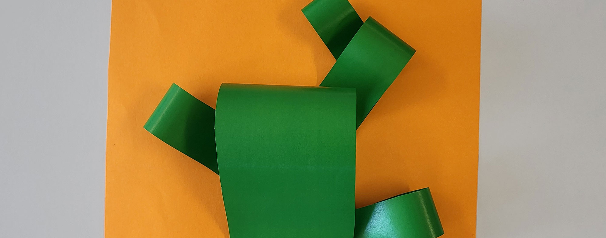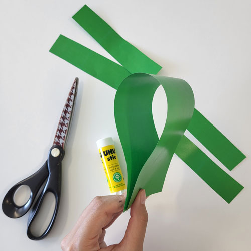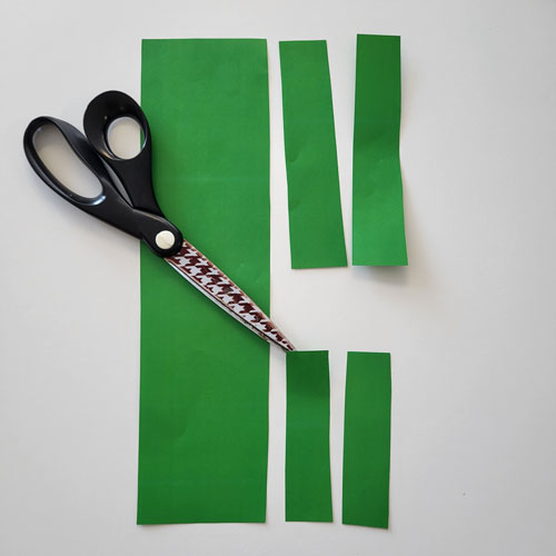 Découpez votre feuille verte de sorte à avoir une longue bande, deux bandes moyennes et deux petites bandes.