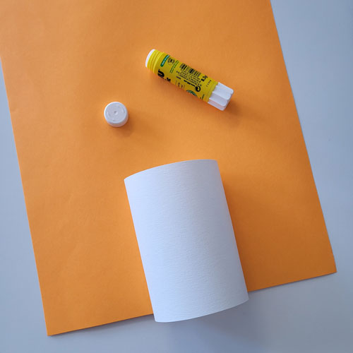 Collez ensuite le rouleau de papier sur votre feuille orange. Aplatissez un peu le rouleau pour obtenir une forme plus rectangulaire.
