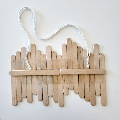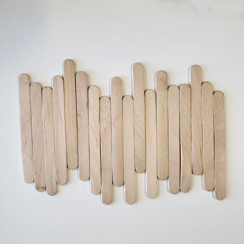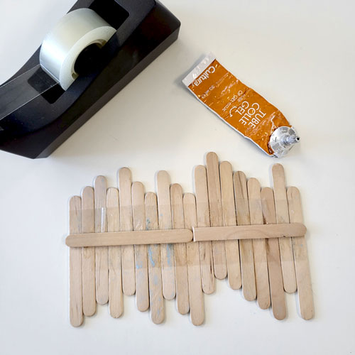 Retournez vos bâtonnets et mettez du scotch en horizontal pour qu’ils ne se détachent pas. Puis, collez deux bâtonnets perpendiculairement à la ligne de bâtons afin de solidifier le tout.