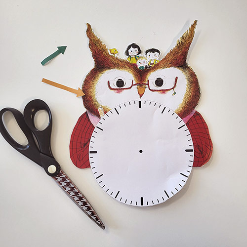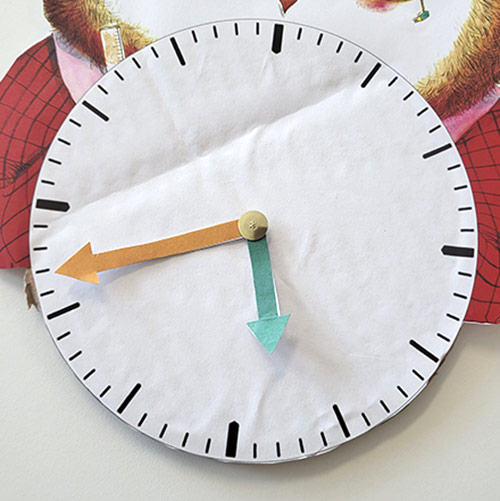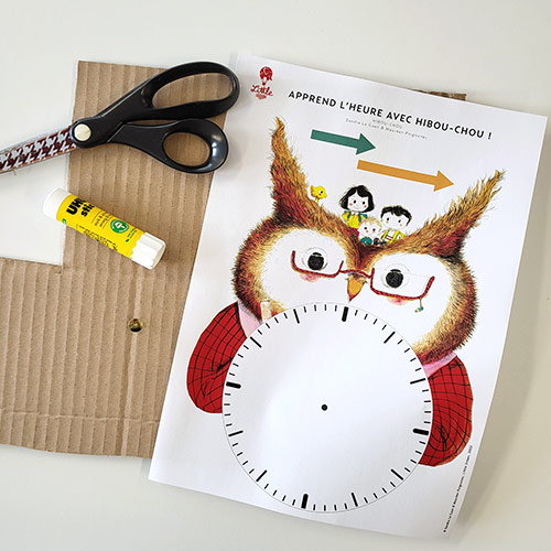 Imprimez votre planche illustrée sur une feuille cartonnée de préférence puis découpez les flèches et l’horloge.