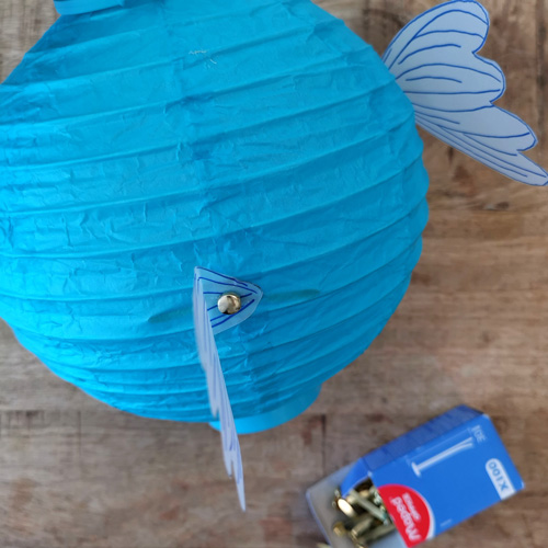 Découpe un trou d’environ 10 cm pour faire la gueule du poisson, si la structure de ta lanterne est en métal, demande à tes parents de couper les tiges avec la pince ! Une fois le trou percé, colle les yeux et les dents.