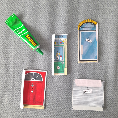 Colle les portes sur les maisons et bâtiments de ton choix.