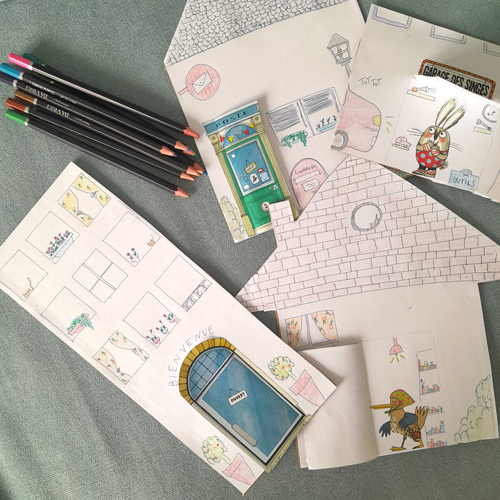 Avec des crayons de couleurs ou des feutres, tu peux maintenant t’amuser à décorer les maisons et bâtiments.