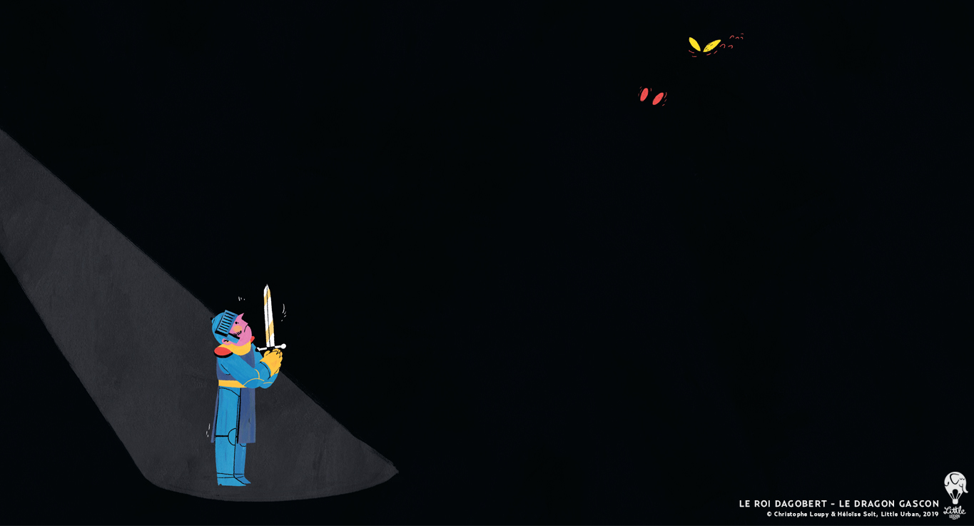 Le Roi Dagobert revient de la guerre. Il n’a qu’une envie, rentrer chez lui. Ce jour-là, il a tout mis à l’endroit. Sa culotte ? À l’endroit. Son armure ? À l’endroit. Son cheval ? À l’endroit. Son château, par contre… Il est pris d’assaut par un terrible dragon gascon.