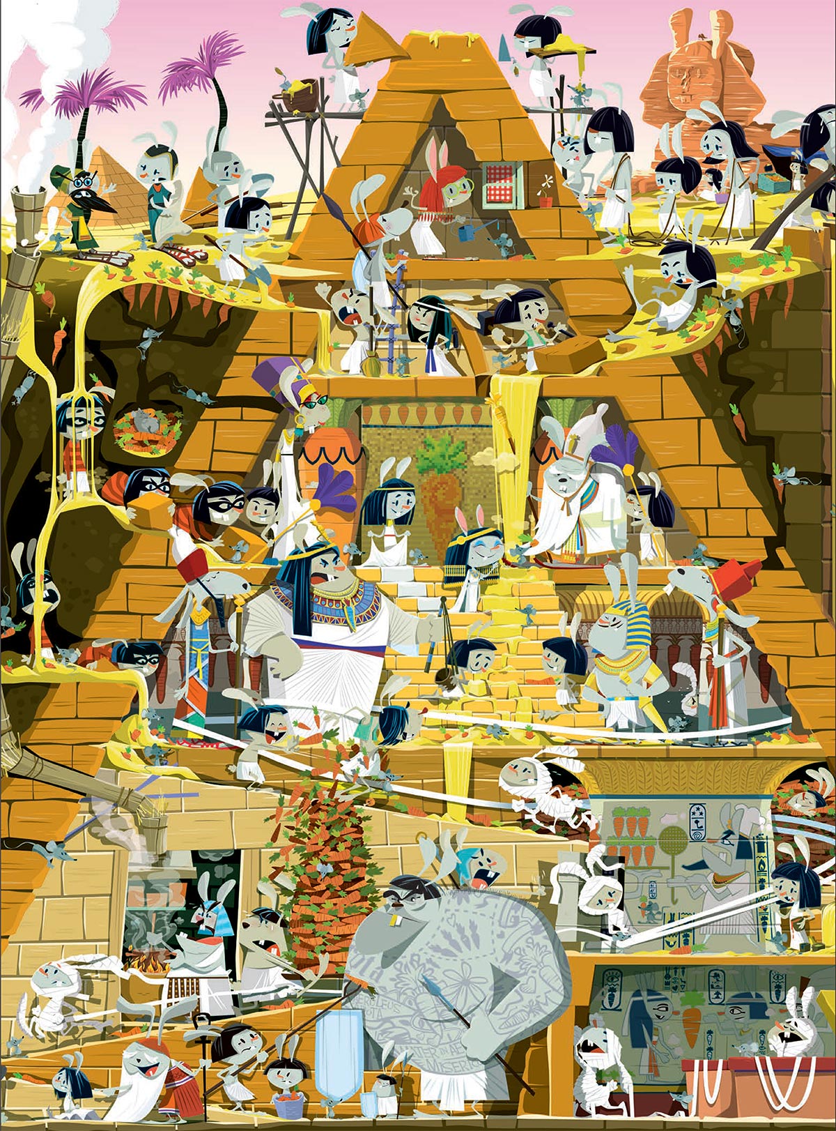 Comme la construction d’une pyramide, pierre après pierre, l’auteur travaille pas à pas chaque illustration qui compose le livre. Sébastien Telleschi a d’abord travaillé des esquisses pour poser les idées générales de l’image. Ensuite, il réalise un dessin au crayon très précis sur du calque (il adore cette texture). Arrive la partie informatique : il numérise le dessin qui lui sert de base.