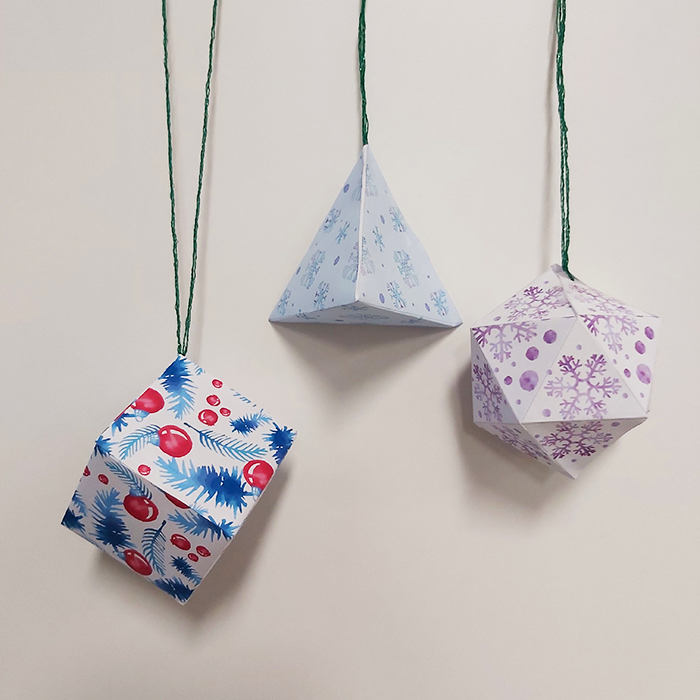 Le cube et la pyramide peuvent être réalisés très simplement par des enfants, l’icosaèdre demande un peu plus de dextérité.