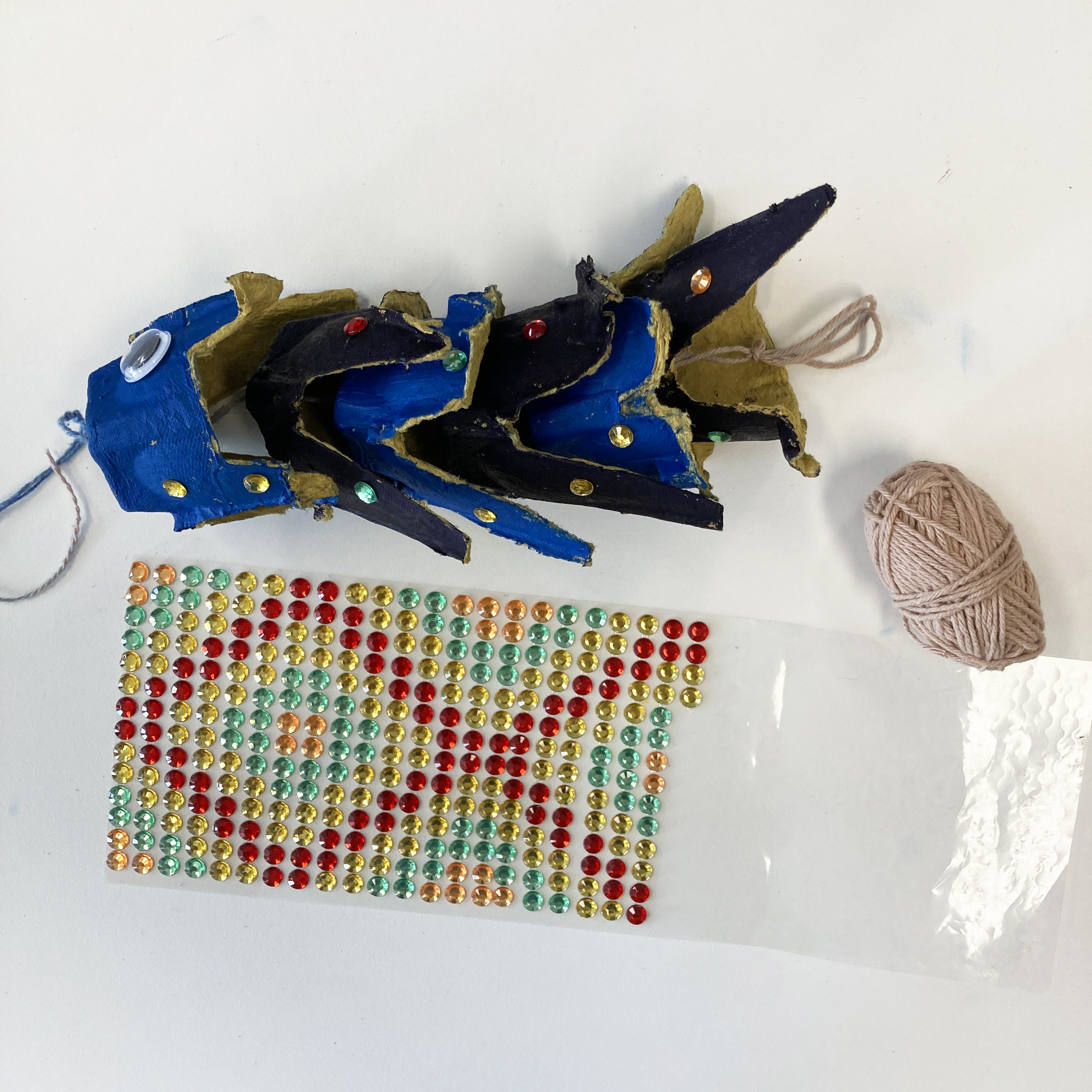 Ta guirlande poisson est prête ! Tu peux maintenant en faire plusieurs au fur et à mesure des boîtes d’œufs que tu trouves à la maison !