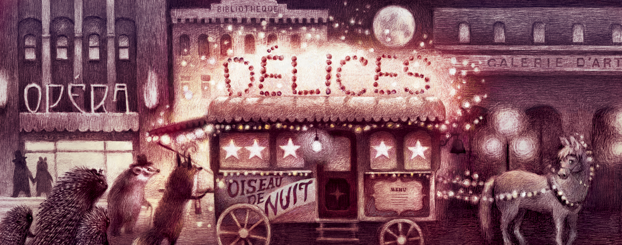 Cataclop cataclop, lune de minuit. Le café-roulotte entre dans la ville endormie. Tiens, tiens, qui se cache par ici ? Une petite souris ! En un battement d’ailes, un festin se prépare…