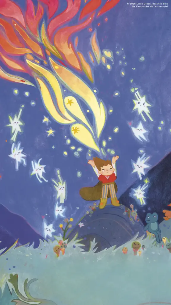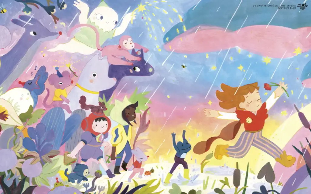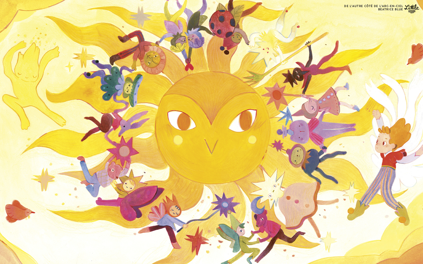 Ouvrez dans un nouvel onglet chaque image issue des illustrations de l’album De l’autre côté de l’arc-en-ciel, de Beatrice Blue, puis faites *clic droit* et téléchargez-les !