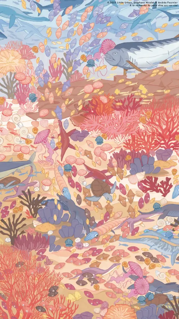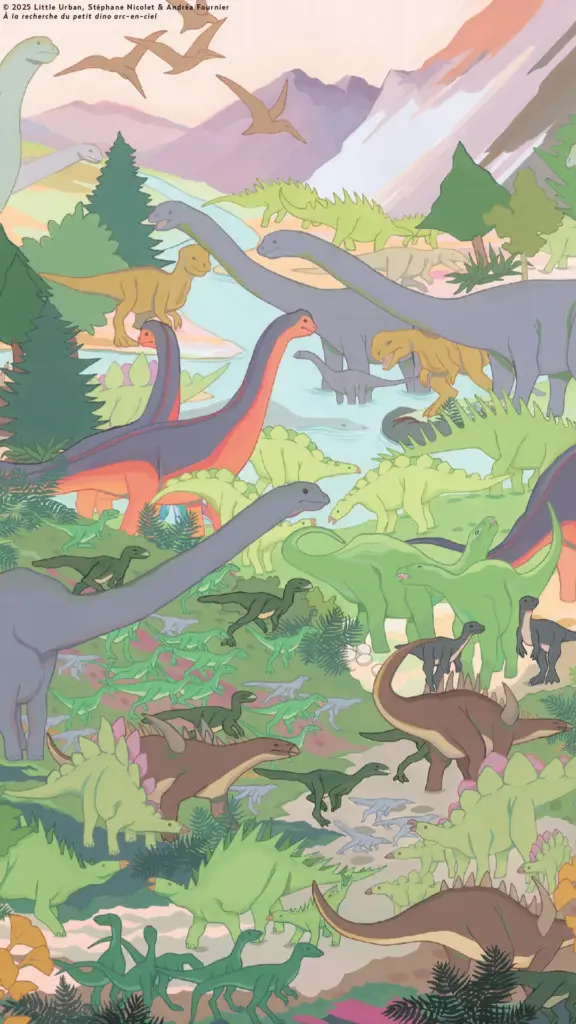 Cliquez sur chaque image issue des illustrations de l’album À la recherche du petit dino arc-en-ciel, de Stéphane Nicolet et Andréa Fournier, puis faites *clic droit* et téléchargez-les !