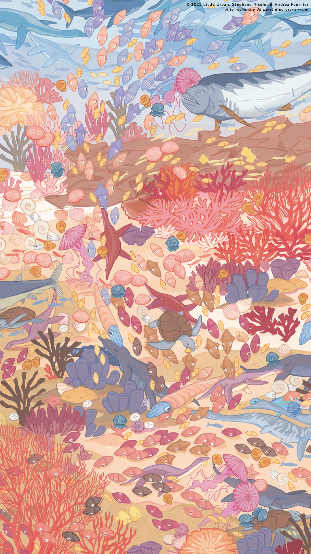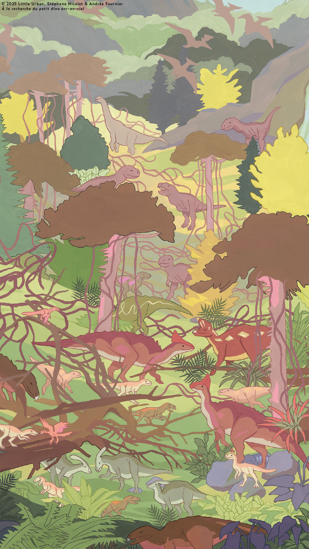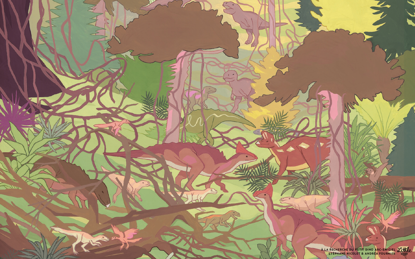 Cliquez sur chaque image issue des illustrations de l’album À la recherche du petit dino arc-en-ciel, de Stéphane Nicolet et Andréa Fournier, puis faites *clic droit* et téléchargez-les !