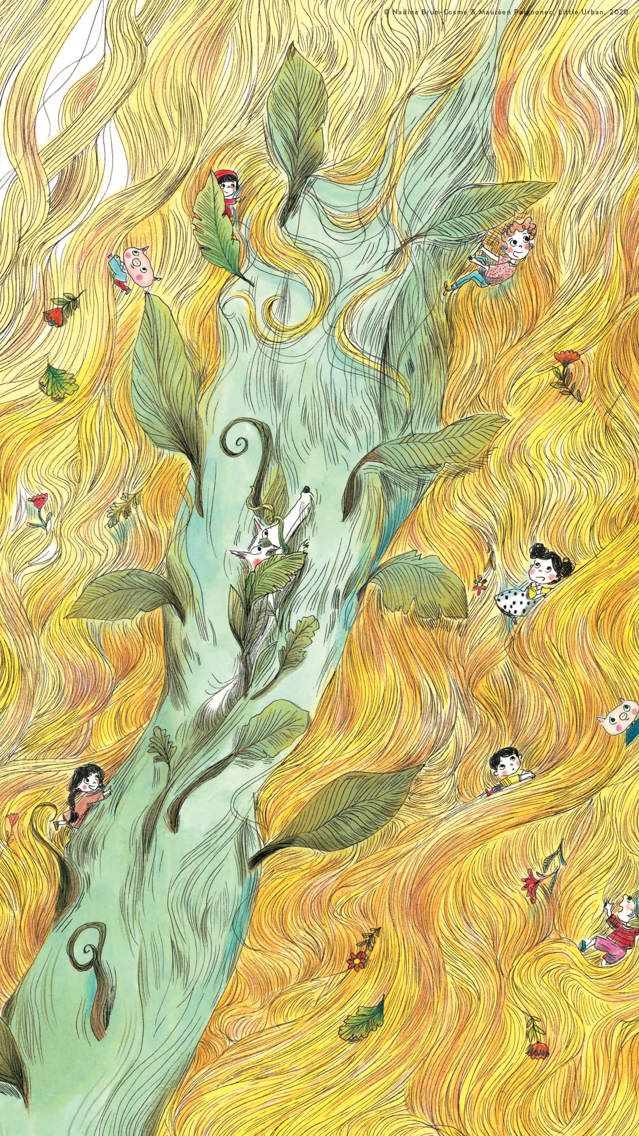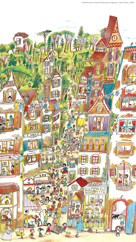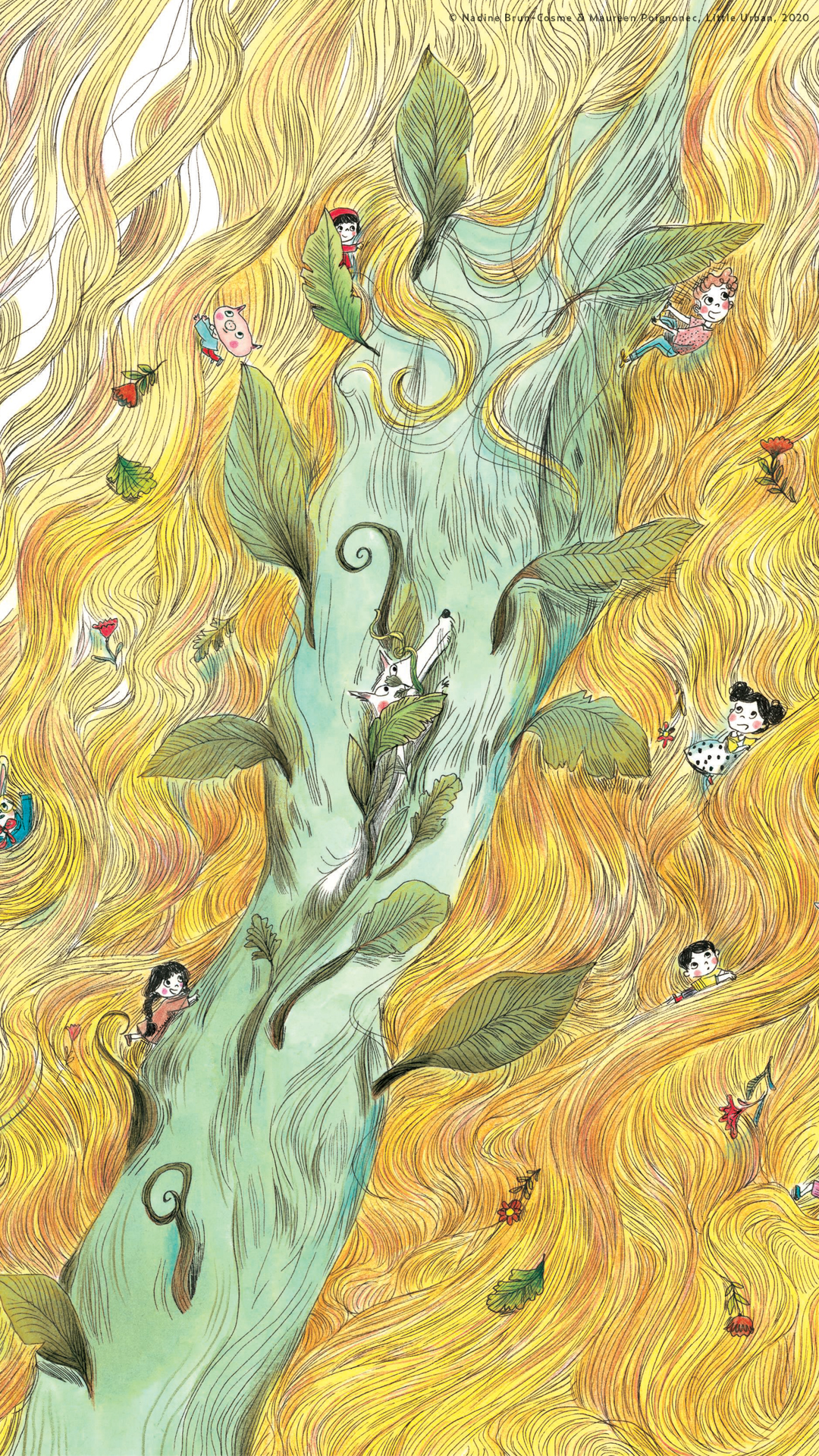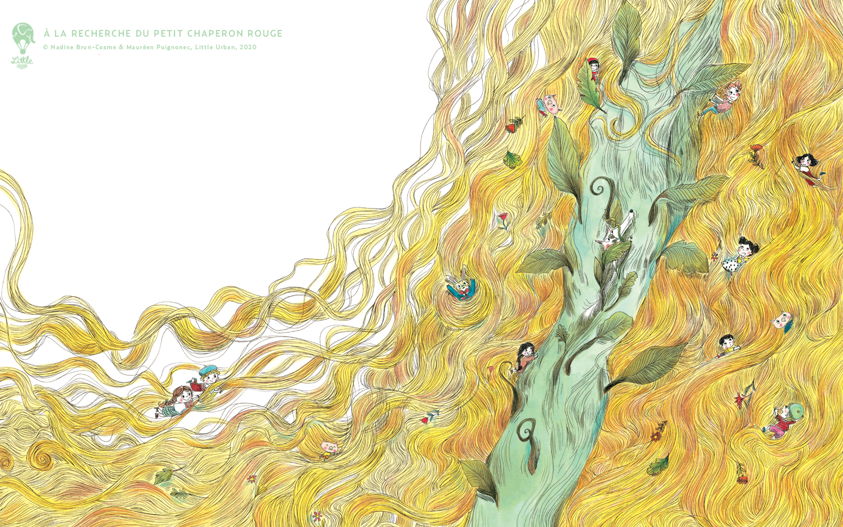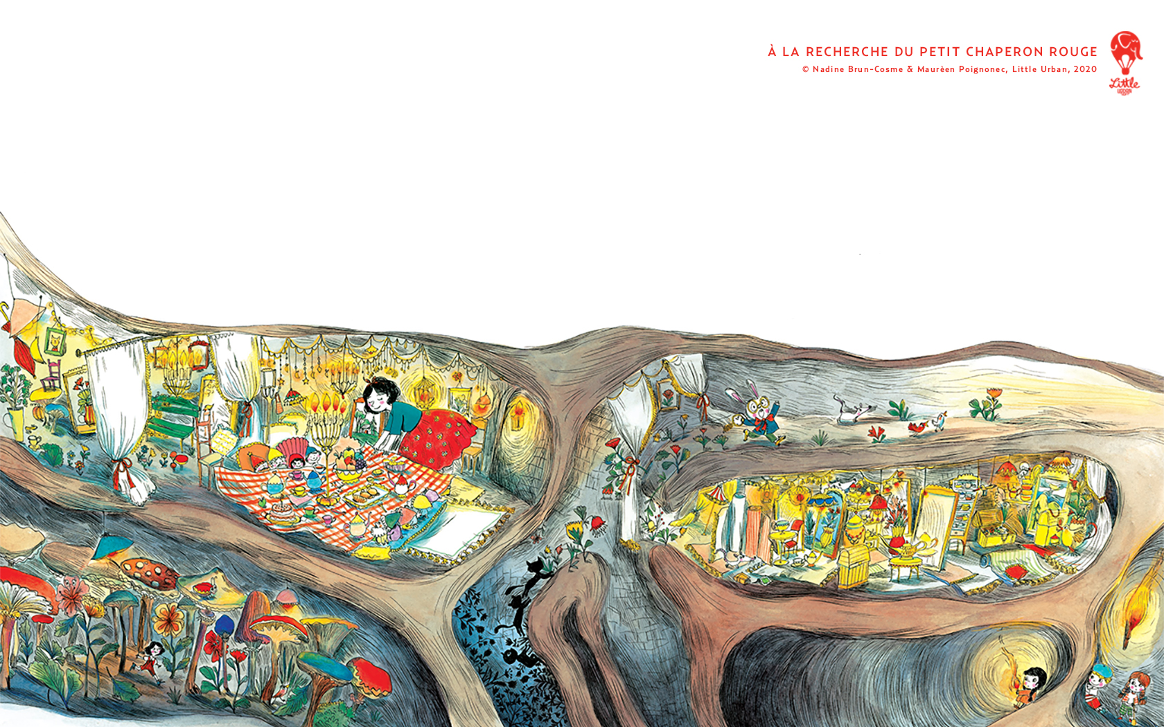 Le Petit Chaperon rouge (et le loup !) traversent villages, forêts et montagnes enneigées d’un royaume enchanté. En chemin, ils croiseront Pinocchio, Hansel et Gretel, Boucle d’or, les trois petits cochons, les musiciens de Brême, la Petite Sirène, Alice, Peter Pan… et bien d’autres !