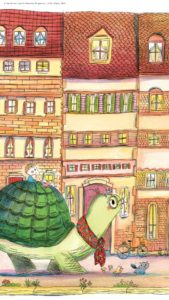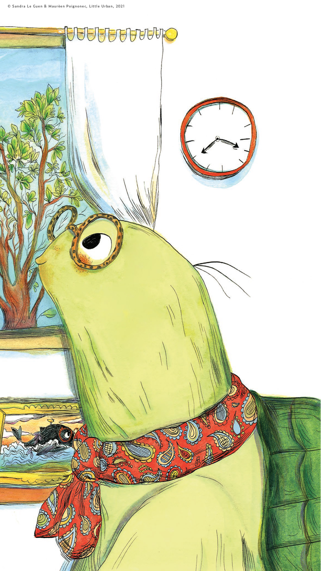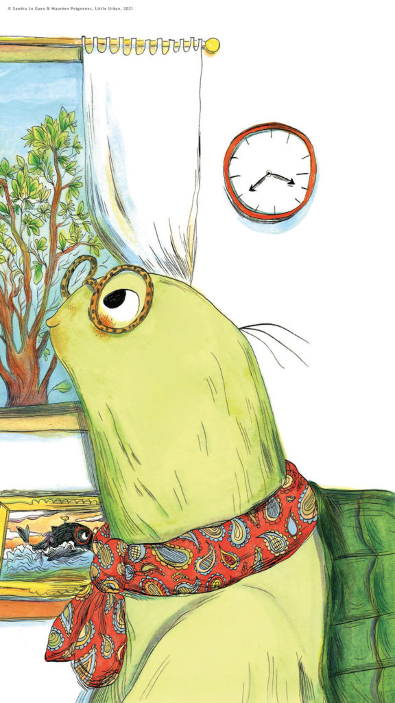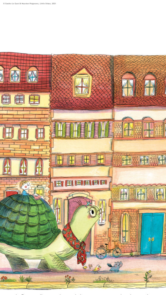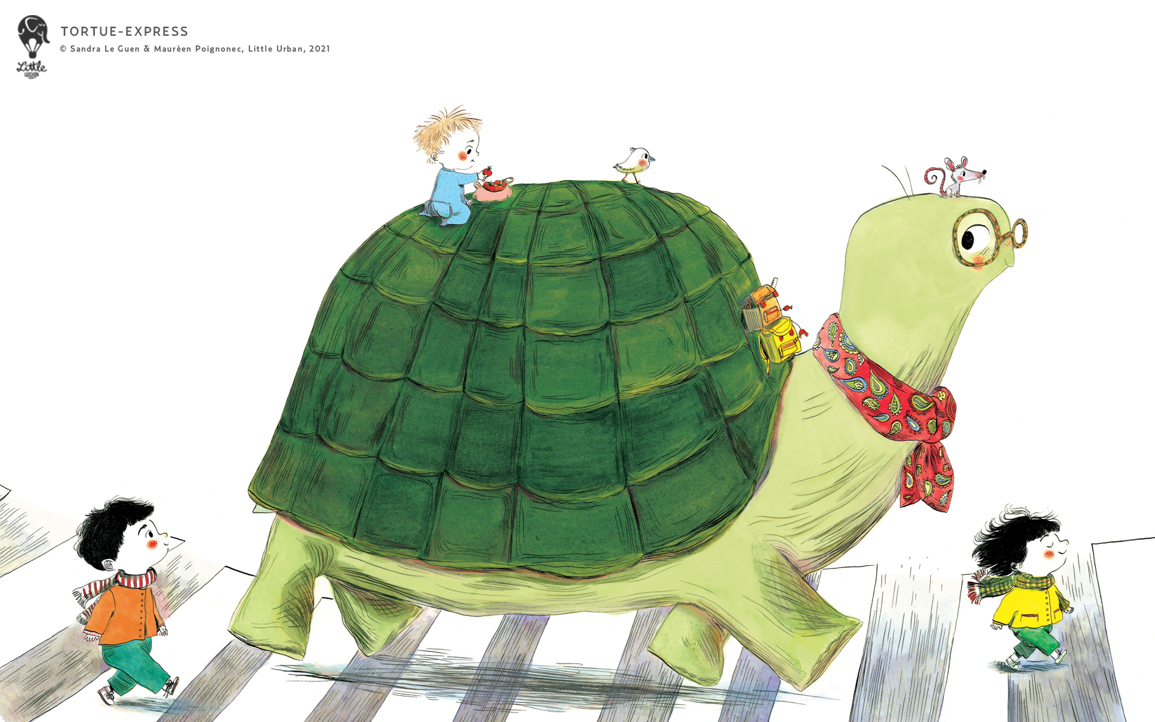 Foulard noué sur son cou ridé, la tortue va d’abord chercher James, le petit dernier, puis l’intrépide Juno et enfin Majé, leur frère aîné. Au cours de sa promenade, la petite troupe partage des instants précieux : flâneries, découvertes, confidences, câlins. Les enfants l’attendent impatiemment. Mais rien ne presse pour Tortue-express.