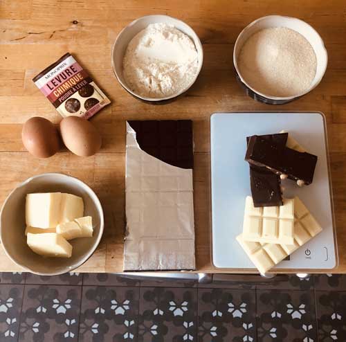 1 tablette de chocolat à dessert (au moins 50% de cacao) 60 g de beurre demi-sel (sinon du beurre doux en ajoutant une ½ cuillère à café de sel pour rehausser le goût du chocolat) 2 œufs 110 g de farine 160 g de cassonade (sinon sucre blond) 1 sachet de levure 150 g de chocolat au choix (blanc, lait, noir avec amandes, Smarties, Carambar… selon les goûts et les restes du placard) coupé en grosses pépites (+ 50 g pour décorer avant cuisson)