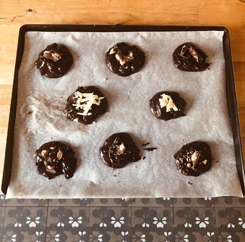 7. Sur une plaque couverte de papier sulfurisé, réalise des dômes de pâte (en quinconce) et recouvre des 50 g de pépites de chocolat restantes pour la déco.