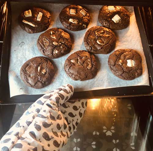 8. Enfourne à 160°c pendant 9/10 minutes (toujours avec un adulte). La surface va alors se craqueler. Les sortir avec une manique (j’adore la mienne avec des baleines, clin d’œil au Taxi-baleine).