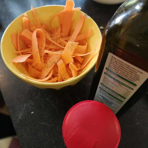Faites mariner les lamelles de carotte dans de l’huile d’olive. Salez, poivrez.
