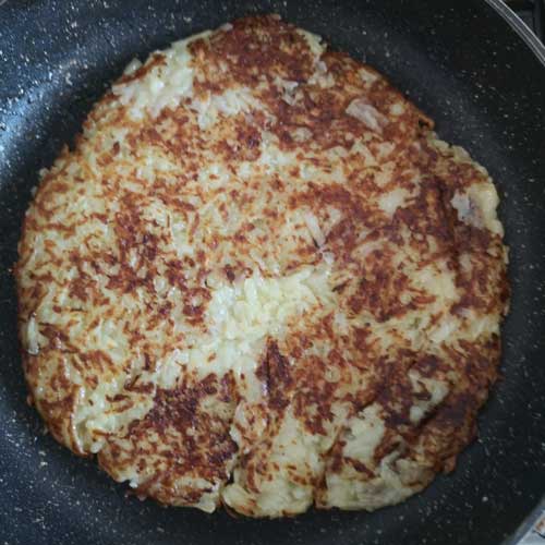 Faites cuire de façon à dorer l’extérieur de la patate. Il faut que l’intérieur soit fondant et l’extérieur croustillant. Retournez la pizza.