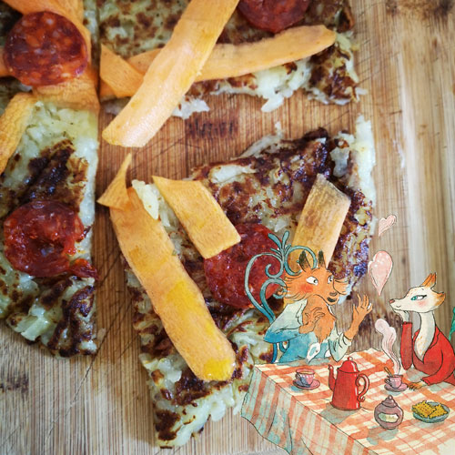 Mettez la pizza bien dorée des deux côtés, sur une planche en bois. Décorez avec les lamelles de carottes et les tranches de chorizo.