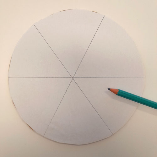 Divise la roue en 6 parts égales. Tu peux la diviser en plus si tu souhaites y faire figurer plus d’éléments différents.