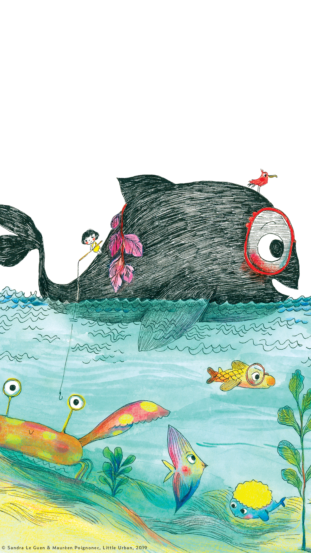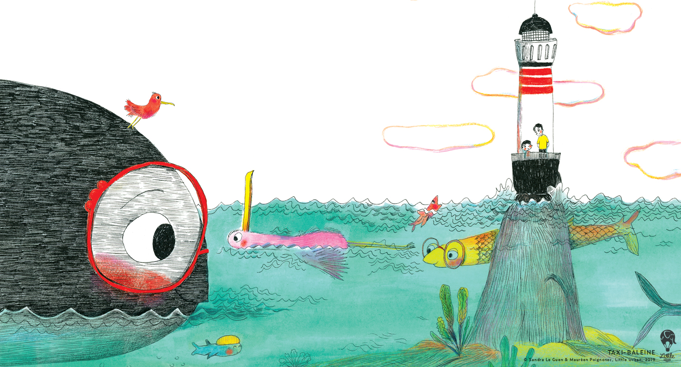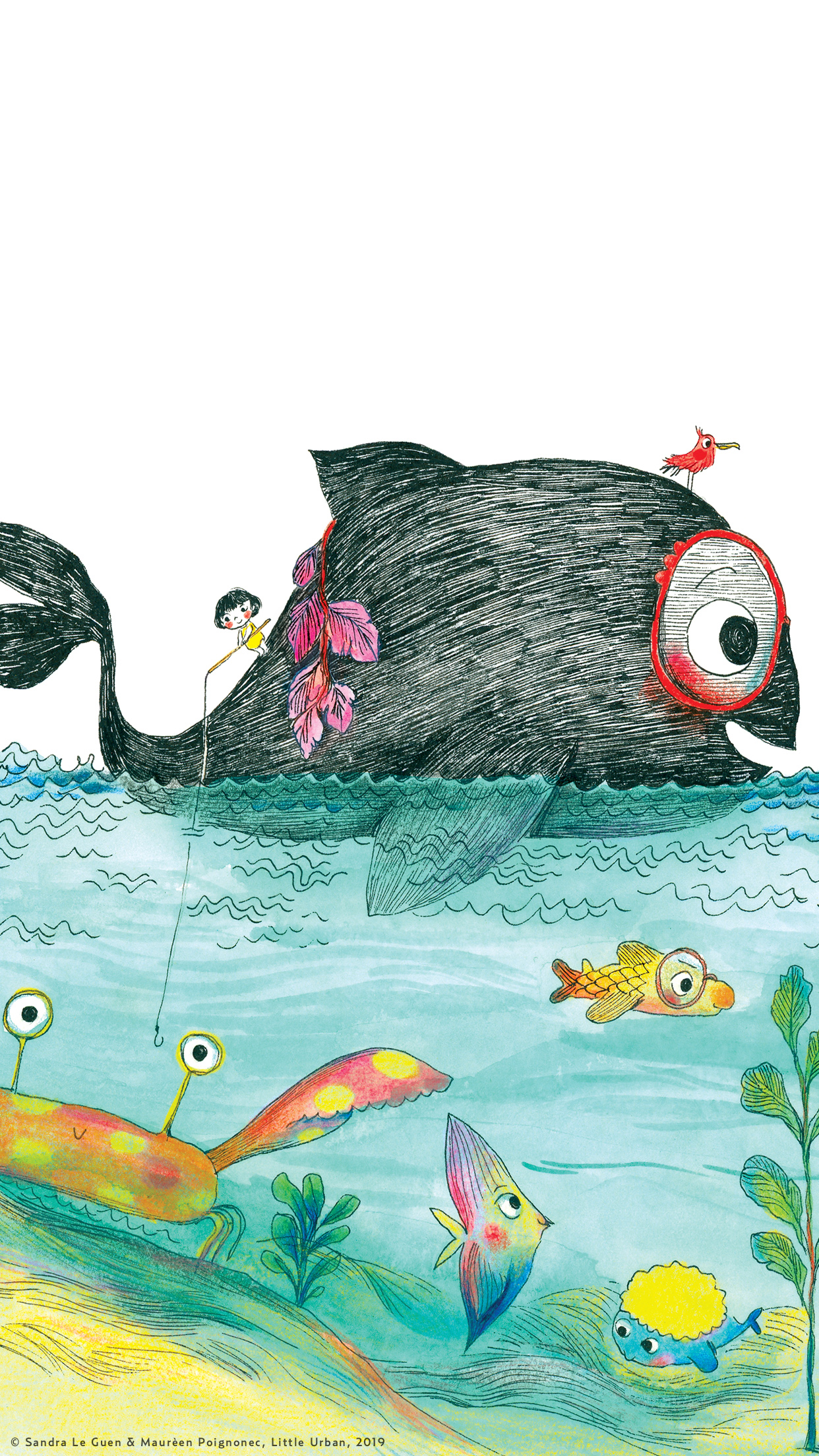 La baleine sourit. La baleine est attendue. Elle aime tellement être taxi. D’une rive à l’autre, elle fait traverser Juno, puis son grand-frère, Majé. Ensemble, ils glissent lentement sur l’océan, pendant neuf mois. Les enfants ont besoin du taxi-baleine. Cela ne durera pas : ils grandissent si vite.