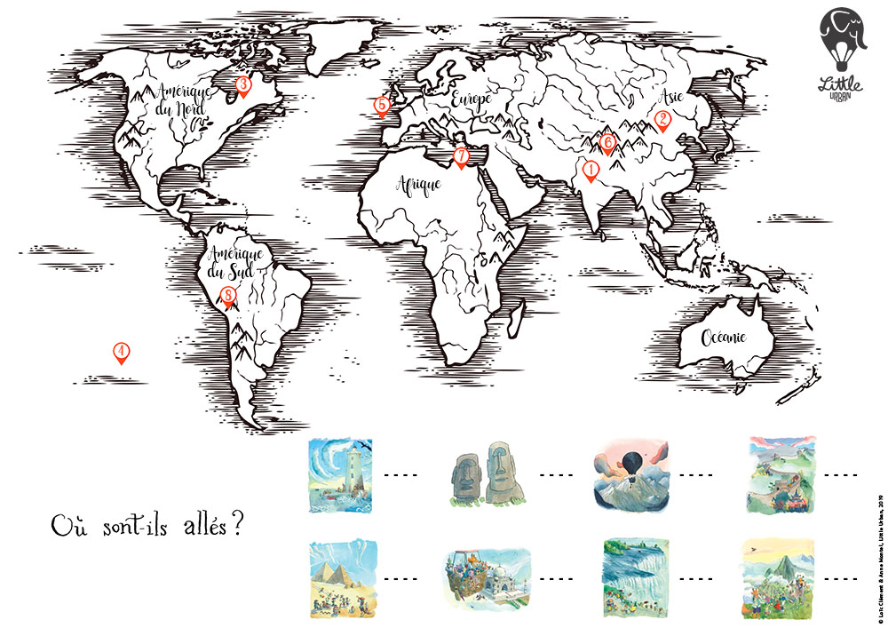 Pour aider Professeur Goupil à retrouver sa bien-aimée, identifiez les huit étapes de son périple ! Ecrivez en face des illustrations le numéro correspondant.